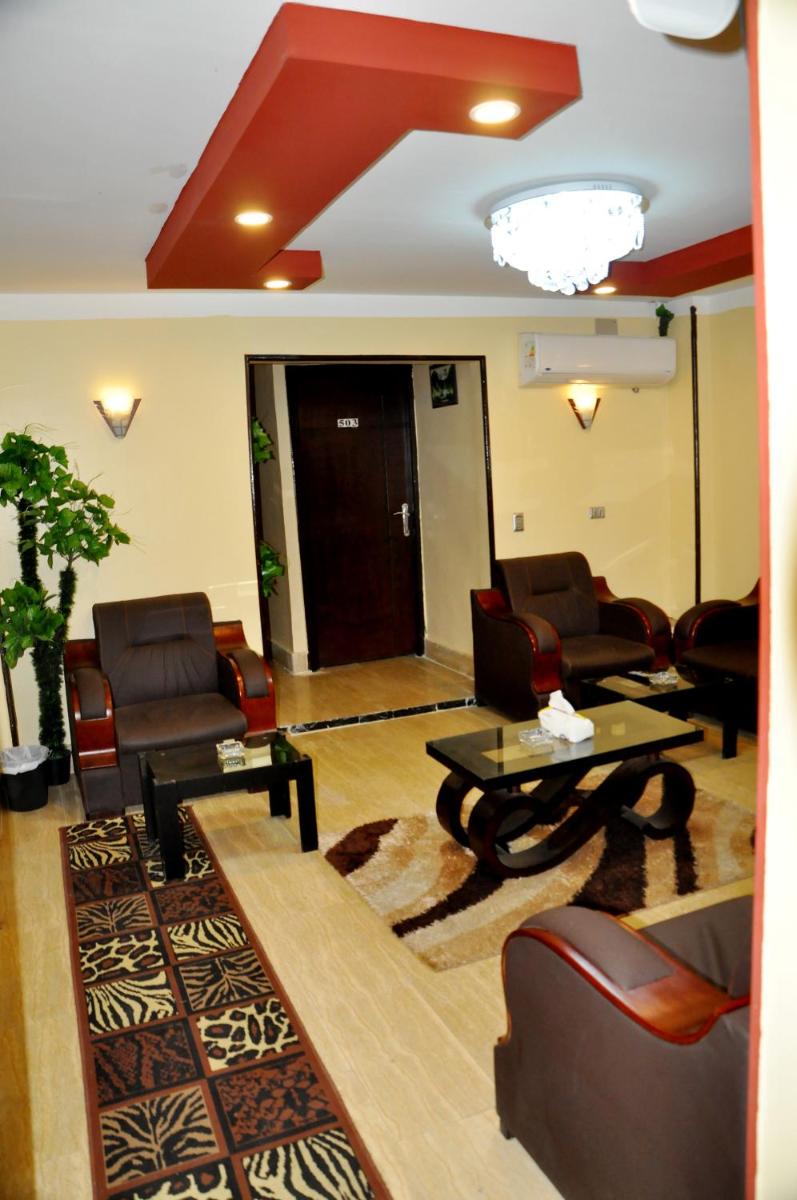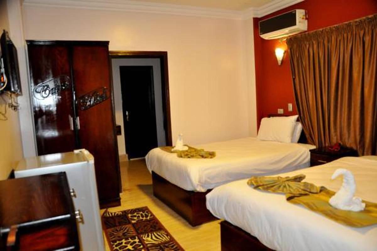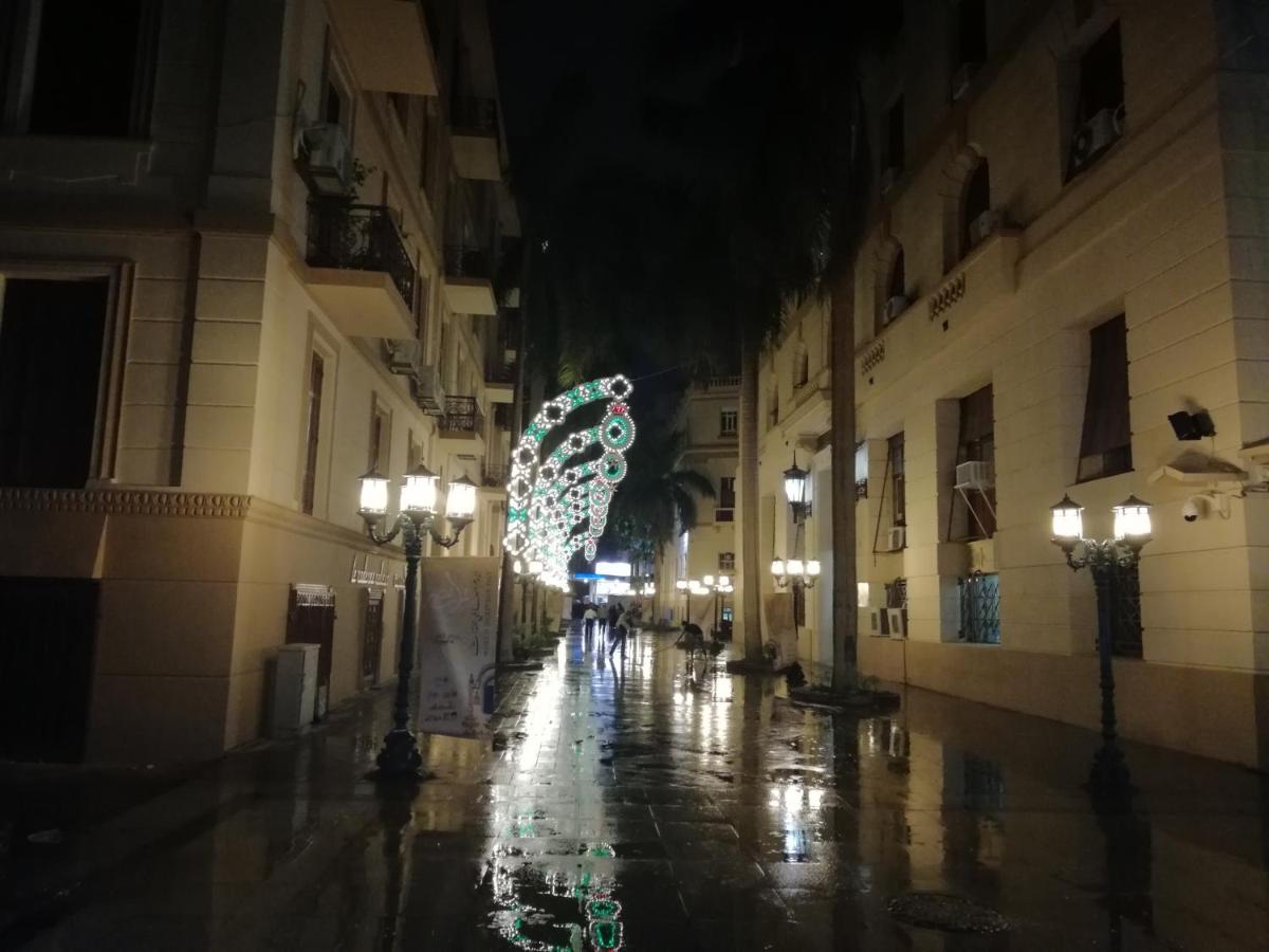 Images show modestly furnished rooms with air conditioning, flat-screen TVs, and shared facilities. The shared lounge reflects a casual, communal atmosphere. The surrounding area captures the active streets and historic structures typical of Downtown Cairo.