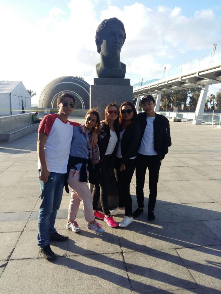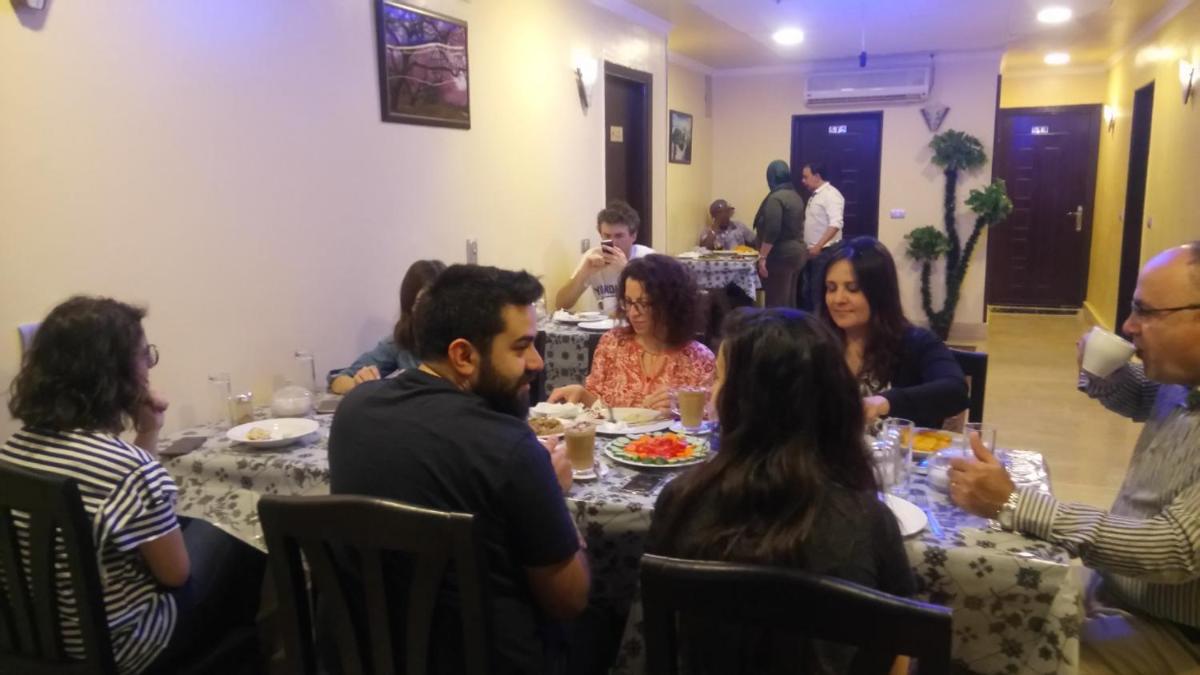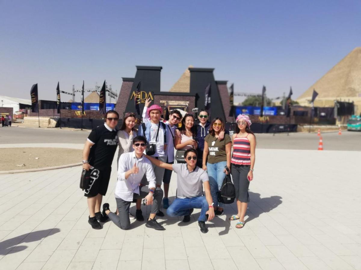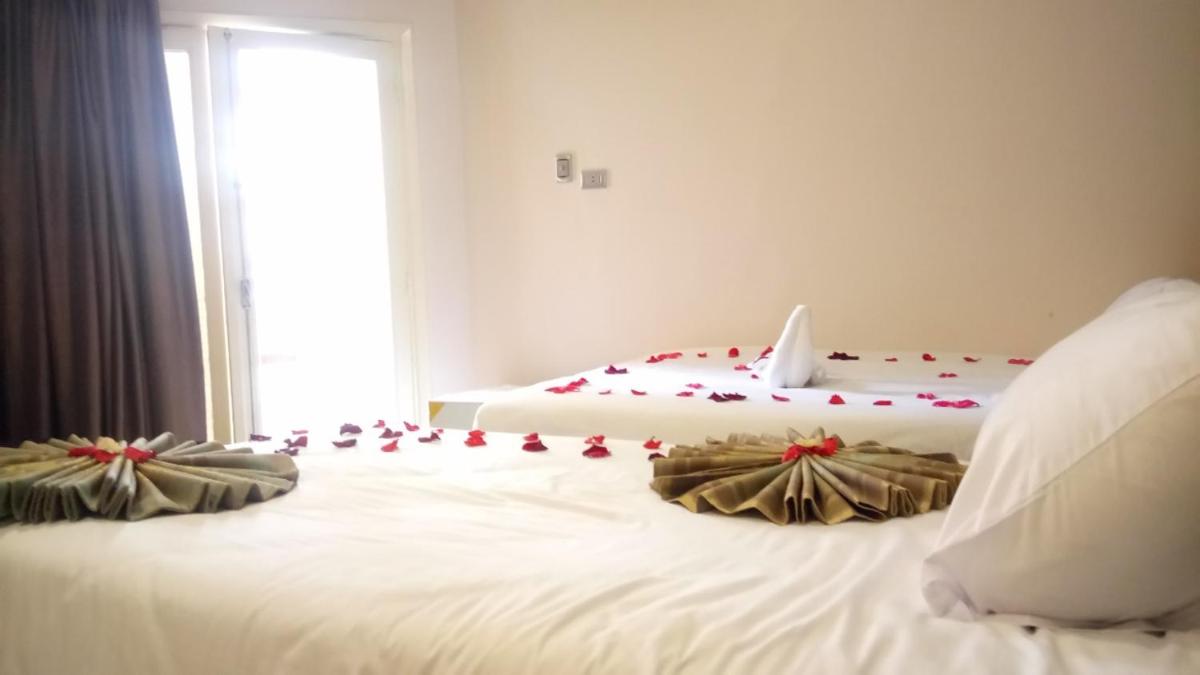 Images show modestly furnished rooms with air conditioning, flat-screen TVs, and shared facilities. The shared lounge reflects a casual, communal atmosphere. The surrounding area captures the active streets and historic structures typical of Downtown Cairo.